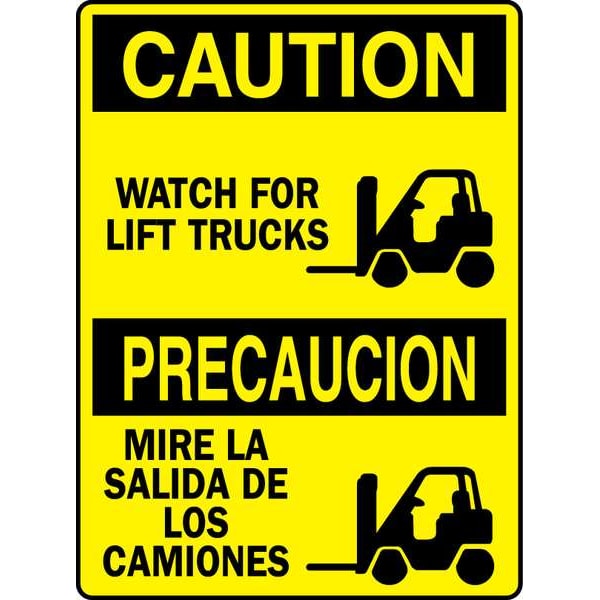 Caution/Precaucion Sign, Sign Subject Matter Lift Truck Traffic, Height 10 In., Width 7 In., Sign Material Polyester, Sign Mounting Style Adhesive Surface, Header Caution/Precaucion, Legend Watch For Lift Trucks/Mire La Salida De Los Camiones, Printed Language English, Spanish, Sign Shape Rectangle