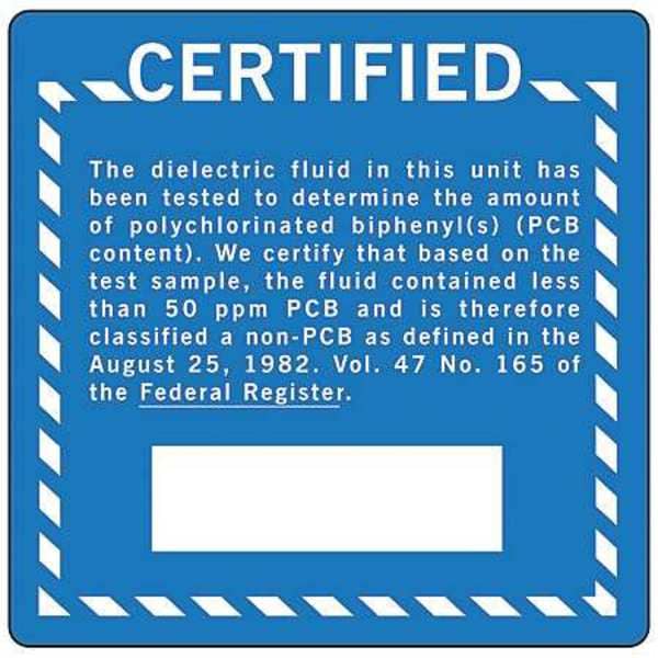 Chemical Label, Square, Number of Printed Sides 1, English, Sign Legend Square Certified The Dielectric Fluid In This Unit Has Been Tested To Determine The Amount Of Polychlorinated Biphenyl(S) (PCB Content)�, Sign Legend Style Text, Package Quantity 100