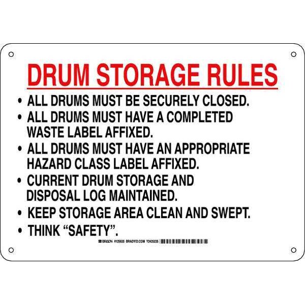 Chemical Sign, Sign Subject Matter Chemical, Gas or Hazardous Materials, Height 10 in, Width 14 in, Sign Material Plastic, Sign Mounting Style With Mounting Holes, Header No Header, Legend Drum Storage Rules All Drums Must Be Securely Closed. All Drums Must Have A Completed Waste Label Affixed. All Drums Must Have An Appropriate Hazard Class Label Affixed. Current Drum Storage And Disposal Log Maintained. Keep Storage Area Clean And Swept Think inSafety in, Printed Language English