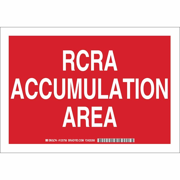 Chemical Sign, Sign Subject Matter Chemical, Gas or Hazardous Materials, Height 10 in, Width 14 in, Sign Material Polyester, Sign Mounting Style Adhesive Surface, Header No Header, Legend Rcra Accumulation Area, Printed Language English, Sign Shape Rectangle