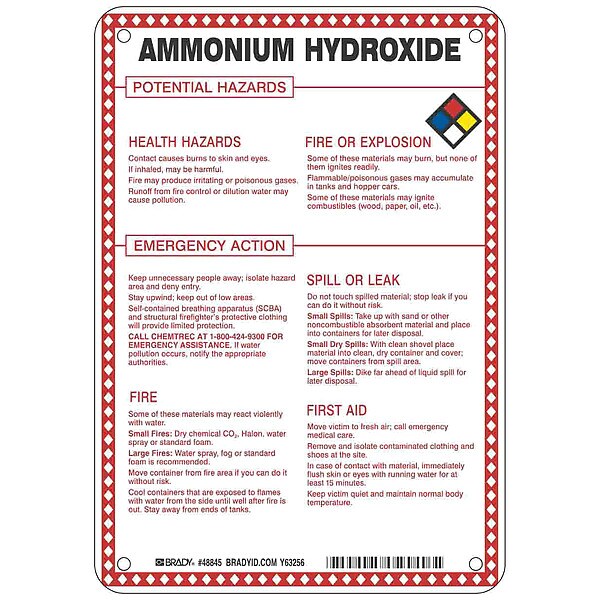 Sign, Ammonium Hydroxide Potential Hazards, Fiberglass, Height 10 in, Width 7 in, Header No Header, Legend Style Symbol and Text, Language English, Mounting Style Mounting Holes, Thickness 0.1 in, Sign Shape Rectangle, Operating Temp. Range -40 Degrees to 194 Degrees F, Retroreflective Grade Not Retroreflective