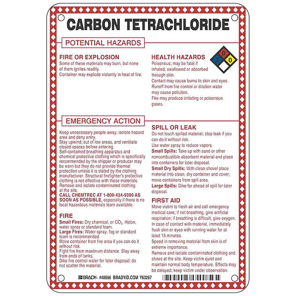 Sign, Carbon Tetrachloride Potential Hazards, Fiberglass, Height 10 in, Width 7 in, Header No Header, Legend Style Symbol and Text, Language English, Mounting Style Mounting Holes, Thickness 0.1 in, Sign Shape Rectangle, Operating Temp. Range -40 Degrees to 194 Degrees F, Retroreflective Grade Not Retroreflective