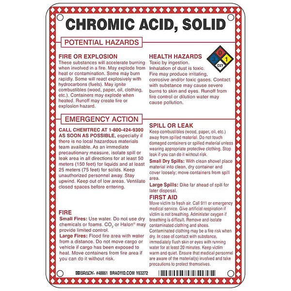 Sign, Chromic Acid, Solid Chromium Anhydride Potential Hazards, Fiberglass, Height 10 in, Width 7 in, Header No Header, Legend Style Symbol and Text, Language English, Mounting Style Mounting Holes, Thickness 0.1 in, Sign Shape Rectangle, Operating Temp. Range -40 Degrees to 194 Degrees F, Retroreflective Grade Not Retroreflective