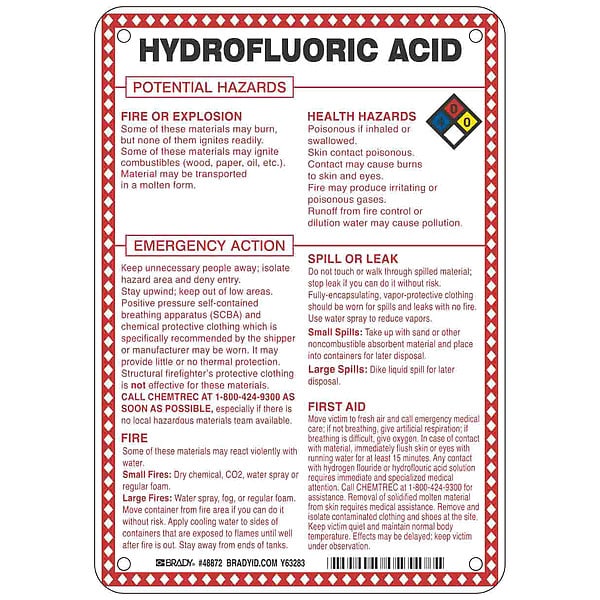Sign, Hydrofluoric Acid Potential Hazards, Fiberglass, Height 10 in, Width 7 in, Header No Header, Legend Style Symbol and Text, Language English, Mounting Style Mounting Holes, Thickness 0.1 in, Sign Shape Rectangle, Operating Temp. Range -40 Degrees to 194 Degrees F, Retroreflective Grade Not Retroreflective