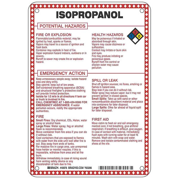 Sign, Isopropanol Potential Hazards, Fiberglass, Height 10 in, Width 7 in, Header No Header, Legend Style Symbol and Text, Language English, Mounting Style Mounting Holes, Thickness 0.1 in, Sign Shape Rectangle, Operating Temp. Range -40 Degrees to 194 Degrees F, Retroreflective Grade Not Retroreflective