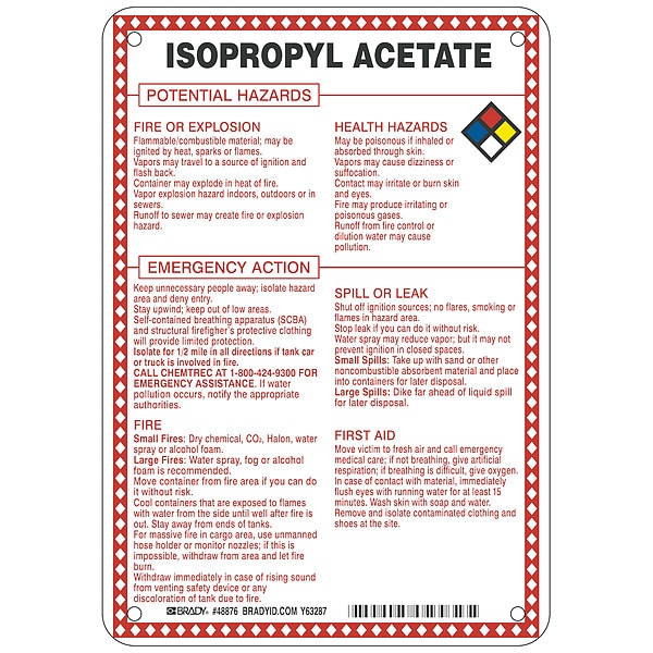 Sign, Isopropyl Acetate Potential Hazards, Fiberglass, Height 10 in, Width 7 in, Header No Header, Legend Style Symbol and Text, Language English, Mounting Style Mounting Holes, Thickness 0.1 in, Sign Shape Rectangle, Operating Temp. Range -40 Degrees to 194 Degrees F, Retroreflective Grade Not Retroreflective