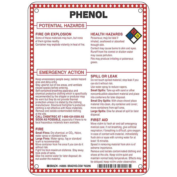Sign, Phenol Potential Hazards, Fiberglass, Height 10 in, Width 7 in, Header No Header, Legend Style Symbol and Text, Language English, Mounting Style Mounting Holes, Thickness 0.1 in, Sign Shape Rectangle, Operating Temp. Range -40 Degrees to 194 Degrees F, Retroreflective Grade Not Retroreflective