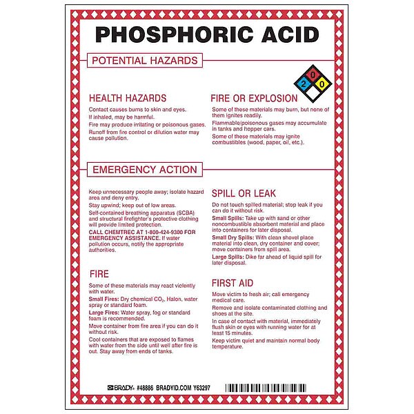 Sign, Phosphoric Acid Potential Hazards, Fiberglass, Height 10 in, Width 7 in, Header No Header, Legend Style Symbol and Text, Language English, Mounting Style Mounting Holes, Thickness 0.1 in, Sign Shape Rectangle, Operating Temp. Range -40 Degrees to 194 Degrees F, Retroreflective Grade Not Retroreflective
