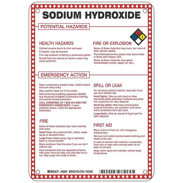 Sign, Sodium Hydroxide Potential Hazards, Fiberglass, Height 10 in, Width 7 in, Header No Header, Legend Style Symbol and Text, Language English, Mounting Style Mounting Holes, Thickness 0.1 in, Sign Shape Rectangle, Operating Temp. Range -40 Degrees to 194 Degrees F, Retroreflective Grade Not Retroreflective