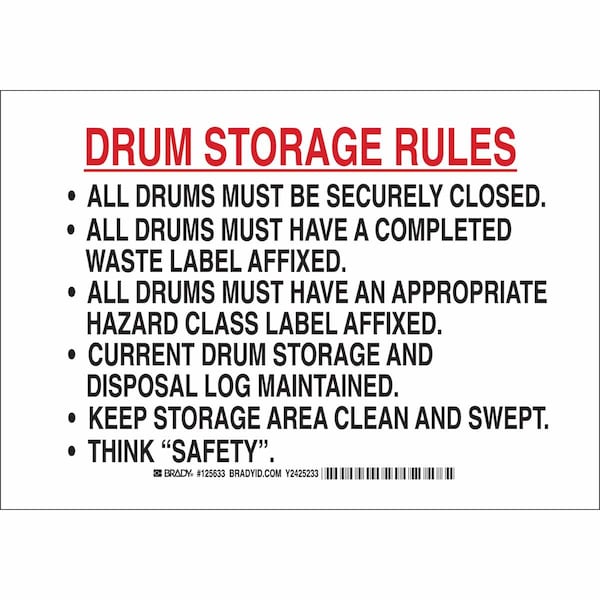 Chemical Sign, Sign Subject Matter Chemical, Gas or Hazardous Materials, Height 7 in, Width 10 in, Sign Material Plastic, Sign Mounting Style With Mounting Holes, Header No Header, Legend Drum Storage Rules All Drums Must Be Securely Closed. All Drums Must Have A Completed Waste Label Affixed. All Drums Must Have An Appropriate Hazard Class Label Affixed. Current Drum Storage And Disposal Log Maintained. Keep Storage Area Clean And Swept Think inSafety in, Printed Language English