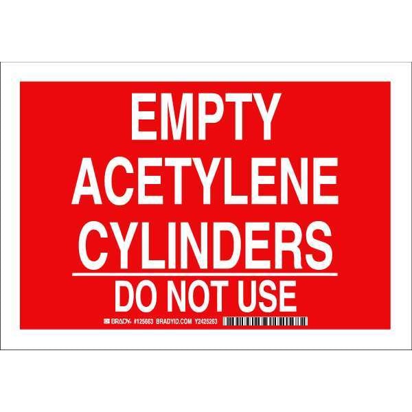 Chemical Sign, Sign Subject Matter Chemical, Gas or Hazardous Materials, Height 7 in, Width 10 in, Sign Material Polyester, Sign Mounting Style Adhesive Surface, Header No Header, Legend Empty Acetylene Cylinders Do Not Use, Printed Language English, Sign Shape Rectangle