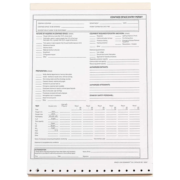 Confined Space Entry Permit, Accessory Type Confined Space Entry Permit, Includes Tie-Off Anchor Point Not Applicable, Length Not Applicable, Color Black, White, For Use With Mfr. No. PC1, Confined Space Component Permit, Material 2-Ply Carbonless, Width 8 1/2 in, Height 11 in, Series Not Applicable, Package Quantity 25