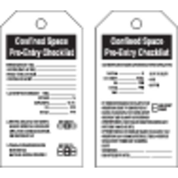 Confined Space Tag, Subject Matter Confined Space, Sign Legend Issued (Date & Time): Expires (Date & Time): Space To Be Entered: Purpose Of Entry:, Legend Same on Both Sides No, Sign Header Confined Space Pre-Entry Checklist, Shape Rectangular, Safety Tag Legend - Back Side 4 Atmospheric Checks (After Isolation & Ventilation), Sign Header -Back Side Confined Space Pre-Entry Checklist, Package Quantity 25