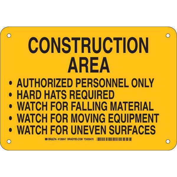 Construction Site Sign, Sign Subject Matter Construction, Height 7 in, Width 10 in, Sign Material Plastic, Sign Mounting Style With Mounting Holes, Header Construction Area, Legend Construction Area Authorized Personnel Only Hard Hats Required Watch For Falling Material Watch For Moving Equipment Watch For Uneven Surfaces, Printed Language English, Sign Shape Rectangle