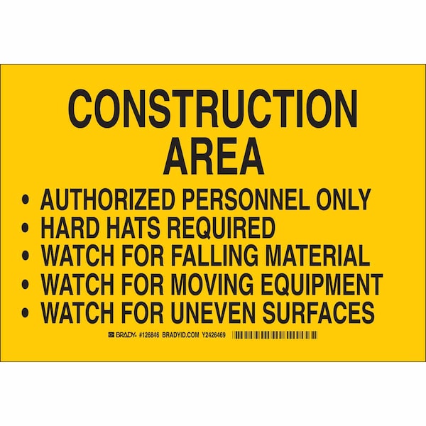Construction Site Sign, Sign Subject Matter Construction, Height 10 in, Width 14 in, Sign Material Aluminum, Sign Mounting Style With Mounting Holes, Header Construction Area, Legend Construction Area Authorized Personnel Only Hard Hats Required Watch For Falling Material Watch For Moving Equipment Watch For Uneven Surfaces, Printed Language English, Sign Shape Rectangle