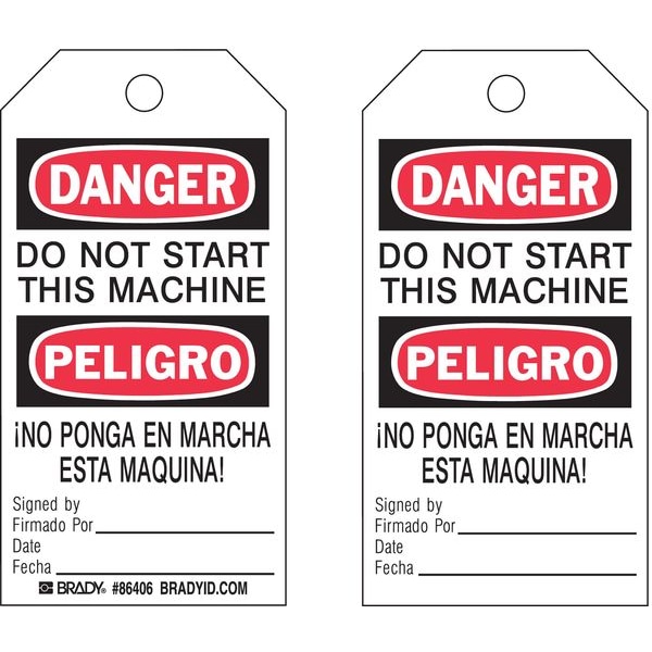 Danger Bilingual Tag, Subject Matter Cleaning and Maintenance, Sign Legend Do Not Start This Machine Ino Ponga En Marcha Esta Maquina! Signed By Firmado Por: Date Fecha:, Legend Same on Both Sides No, Sign Header Danger/Peligro, Shape Rectangular, Safety Tag Legend - Back Side Do Not Start This Machine Ino Ponga En Marcha Esta Maquina! Signed By Firmado Por: Date Fecha:, Sign Header -Back Side Danger/Peligro, Package Quantity 10