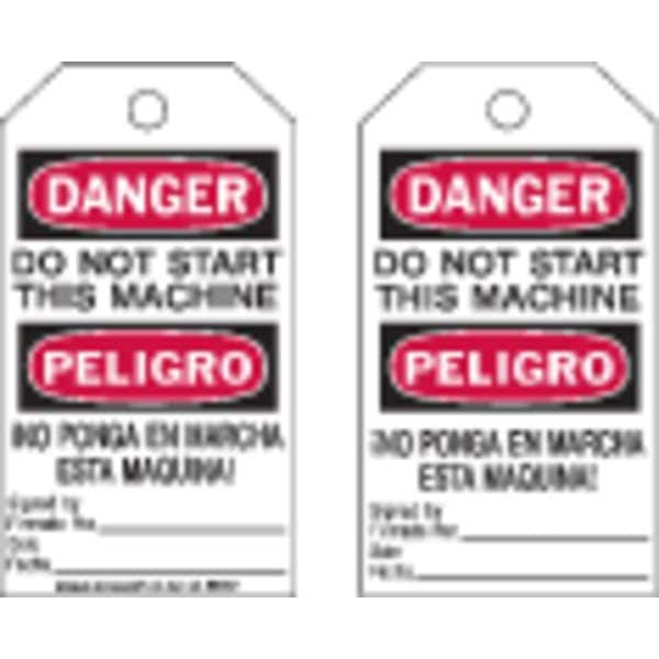 Danger Bilingual Tag, Subject Matter Cleaning and Maintenance, Sign Legend Do Not Start This Machine Ino Ponga En Marcha Esta Maquina! Signed By Firmado Por: Date Fecha:, Legend Same on Both Sides Yes, Sign Header Danger/Peligro, Shape Rectangular, Safety Tag Legend - Back Side Do Not Start This Machine Ino Ponga En Marcha Esta Maquina! Signed By Firmado Por: Date Fecha:, Sign Header -Back Side Danger/Peligro, Package Quantity 10