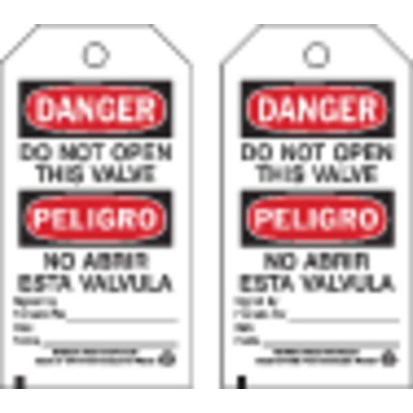 Danger Bilingual Tag, Subject Matter Lockout Tagout, Sign Legend Do Not Open This Valve No Abrir Esta Valvula Signed By Firmado Por: Date Fecha:, Legend Same on Both Sides No, Sign Header Danger/Peligro, Shape Rectangular, Safety Tag Legend - Back Side Do Not Open This Valve No Abrir Esta Valvula Signed By Firmado Por: Date Fecha:, Sign Header -Back Side Danger/Peligro, Package Quantity 10