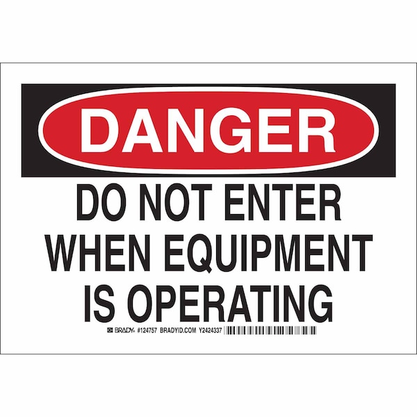 Danger Sign, Sign Subject Matter Machine and Operational, Height 10 In., Width 14 In., Sign Material Plastic, Sign Mounting Style With Mounting Holes, Header Danger, Legend Do Not Enter When Equipment Is Operating, Printed Language English, Sign Shape Rectangle