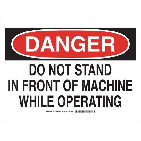 Danger Sign, Sign Subject Matter Machine and Operational, Height 10 In., Width 14 In., Sign Material Polyester, Sign Mounting Style Adhesive Surface, Header Danger, Legend Do Not Stand In Front Of Machine While Operating, Printed Language English, Sign Shape Rectangle