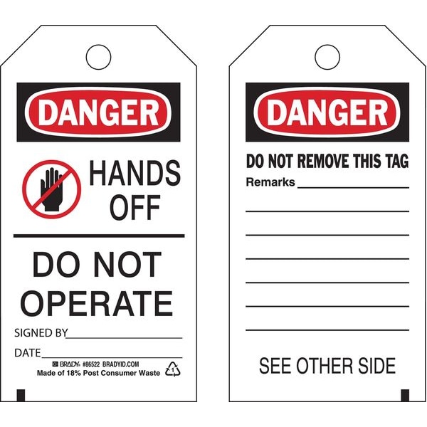 Danger Tag, Front Side Legend HANDS OFF DO NOT OPERATE SIGNED BY___DATE___, Header Danger, Language English, Legend Type Text, Mount Type Nylon Ties, Number of Printed Sides 2, Overall Height 5 3/4 in, Overall Width 3 in, Reverse Side Legend Do Not Remove Tag, Sign Background Color White, Sign Material Polyester, Sign Out Sections Date, Remarks, Signed By, Signage Type Tag, Write-On Surface Yes, For Location Outdoor, For Use With General Equipment, Grommet Material Metal