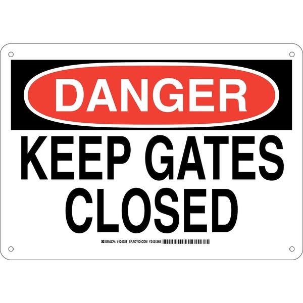 Danger Sign, Sign Subject Matter Door Instruction, Height 10 In., Width 14 In., Sign Material Aluminum, Sign Mounting Style With Mounting Holes, Header Danger, Legend Keep Gates Closed, Printed Language English, Sign Shape Rectangle