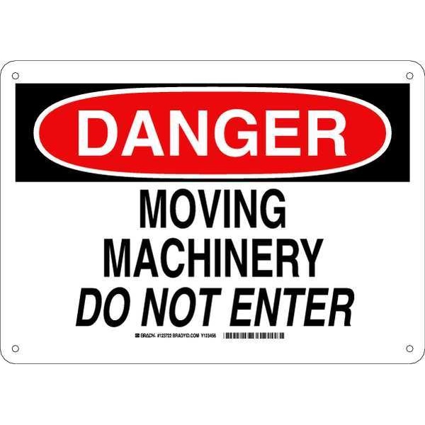 Danger Sign, Sign Subject Matter Machine and Operational, Height 10 In., Width 14 In., Sign Material Aluminum, Sign Mounting Style With Mounting Holes, Header Danger, Legend Moving Machinery Do Not Enter, Printed Language English, Sign Shape Rectangle