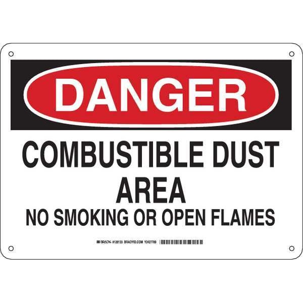 Danger No Smoking Sign, Sign Subject Matter No Smoking, Height 10 in, Width 14 in, Sign Material Aluminum, Sign Mounting Style With Mounting Holes, Header Danger, Legend Combustible Dust Area No Smoking Or Open Flames, Printed Language English, Sign Shape Rectangle