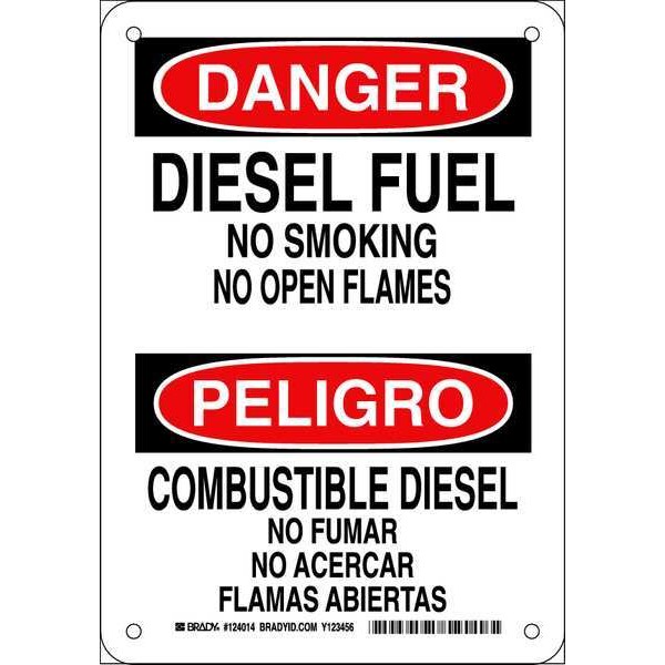 Danger No Smoking Sign, Sign Subject Matter No Smoking, Height 10 in, Width 7 in, Sign Material Plastic, Sign Mounting Style With Mounting Holes, Header Danger/Peligro, Legend Diesel Fuel No Smoking No Open Flames/Combustible No Fumar No Encender Flamas, Printed Language English, Spanish, Sign Shape Rectangle