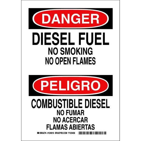 Danger No Smoking Sign, Sign Subject Matter No Smoking, Height 10 in, Width 7 in, Sign Material Polyester, Sign Mounting Style Adhesive Surface, Header Danger/Peligro, Legend Diesel Fuel No Smoking No Open Flames/Combustible No Fumar No Encender Flamas, Printed Language English, Spanish, Sign Shape Rectangle