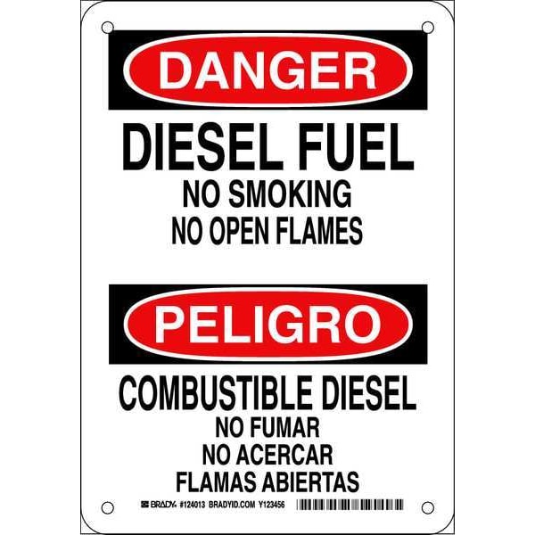 Danger No Smoking Sign, Sign Subject Matter No Smoking, Height 10 in, Width 7 in, Sign Material Aluminum, Sign Mounting Style With Mounting Holes, Header Danger/Peligro, Legend Diesel Fuel No Smoking No Open Flames/Combustible No Fumar No Encender Flamas, Printed Language English, Spanish, Sign Shape Rectangle