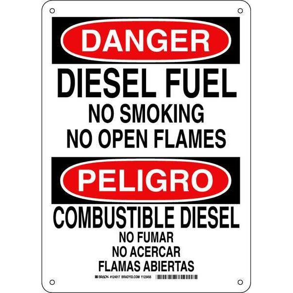 Danger No Smoking Sign, Sign Subject Matter No Smoking, Height 14 in, Width 10 in, Sign Material Plastic, Sign Mounting Style With Mounting Holes, Header Danger/Peligro, Legend Diesel Fuel No Smoking No Open Flames/Combustible No Fumar No Encender Flamas, Printed Language English, Spanish, Sign Shape Rectangle