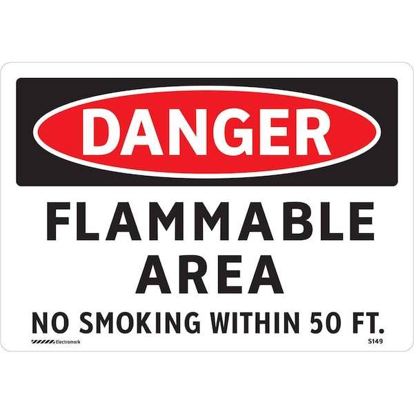 Danger No Smoking Sign, Sign Subject Matter No Smoking, Height 7 in, Width 10 in, Sign Material Vinyl, Sign Mounting Style Adhesive Surface, Header Danger, Legend Flammable Area No Smoking Within 50 Ft., Printed Language English, Sign Shape Rectangle