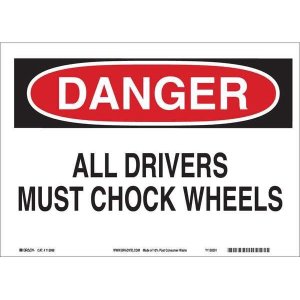 Danger Sign, Sign Subject Matter Chock Wheels, Height 10 In., Width 14 In., Sign Material Plastic, Sign Mounting Style With Mounting Holes, Header Danger, Legend All Drivers Must Chock Wheels, Printed Language English, Sign Shape Rectangle