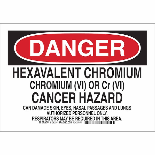 Danger Sign, Sign Subject Matter Health Hazard, Height 10 in, Width 14 in, Sign Material Plastic, Sign Mounting Style With Mounting Holes, Header Danger, Legend Hexavalent Chromium Chromium (Vi) Or Cr (Vi) Cancer Hazard Can Damage Skin, Eyes, Nasal Passages And Lungs. Authorized Personnel Only. Respirators May Be Required In This Area., Printed Language English, Sign Shape Rectangle
