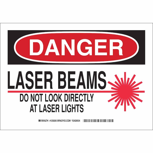 Danger Sign, Sign Subject Matter Laser Hazard, Height 10 in, Width 14 in, Sign Material Polyester, Sign Mounting Style Adhesive Surface, Header Danger, Legend Laser Beams Do Not Look Directly At Laser Lights, Printed Language English, Sign Shape Rectangle