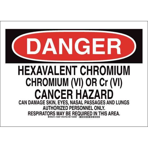 Danger Sign, Sign Subject Matter Health Hazard, Height 10 in, Width 14 in, Sign Material Polyester, Sign Mounting Style Adhesive Surface, Header Danger, Legend Hexavalent Chromium Chromium (Vi) Or Cr (Vi) Cancer Hazard Can Damage Skin, Eyes, Nasal Passages And Lungs. Authorized Personnel Only. Respirators May Be Required In This Area., Printed Language English, Sign Shape Rectangle