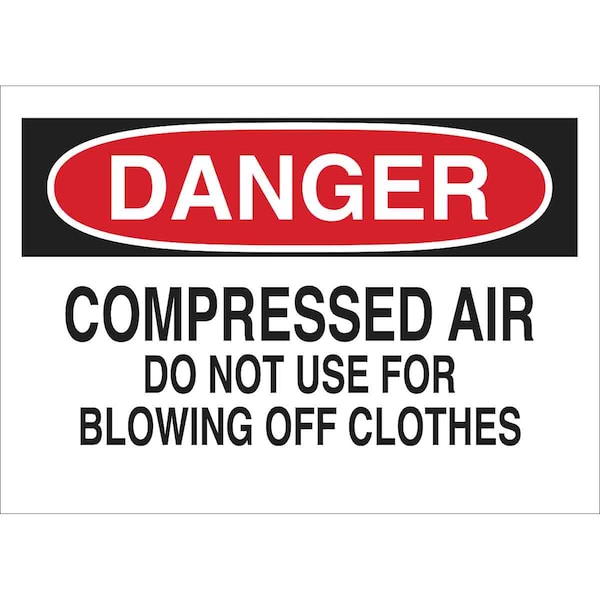Danger Sign, Sign Subject Matter Chemical, Gas or Hazardous Materials, Height 10 in, Width 14 in, Sign Material Polyester, Sign Mounting Style Adhesive Surface, Header Danger, Legend Compressed Air Do Not Use For Blowing Off Clothes, Printed Language English, Sign Shape Rectangle