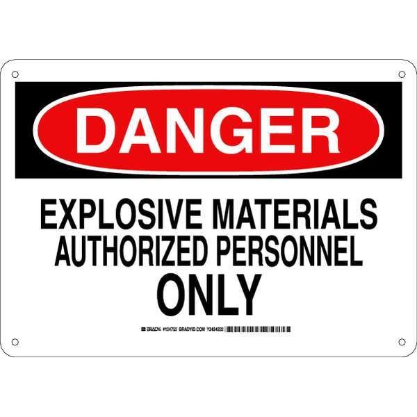 Danger Sign, Sign Subject Matter Authorized Personnel and Restricted Access, Height 10 in, Width 14 in, Sign Material Aluminum, Sign Mounting Style With Mounting Holes, Header Danger, Legend Explosive Materials Authorized Personnel Only, Printed Language English, Sign Shape Rectangle
