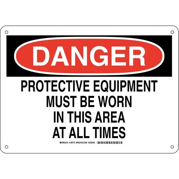 Danger Sign, Sign Subject Matter Personal Protection, Height 10 in, Width 14 in, Sign Material Aluminum, Sign Mounting Style With Mounting Holes, Header Danger, Legend Protective Equipment Must Be Worn In This Area At All Times, Printed Language English, Sign Shape Rectangle