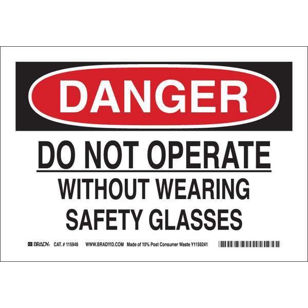 Danger Sign, Sign Subject Matter Personal Protection, Height 10 in, Width 14 in, Sign Material Plastic, Sign Mounting Style With Mounting Holes, Header Danger, Legend Do Not Operate Without Wearing Safety Glasses, Printed Language English, Sign Shape Rectangle