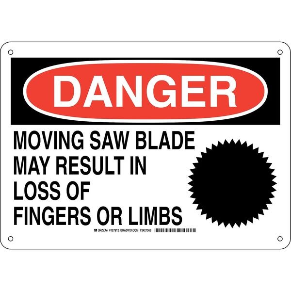 Danger Sign, Sign Subject Matter Keep Hands Clear, Height 10 in, Width 14 in, Sign Material Plastic, Sign Mounting Style With Mounting Holes, Header Danger, Legend Moving Saw Blade May Result In Loss of Fingers Or Limbs, Printed Language English, Sign Shape Rectangle