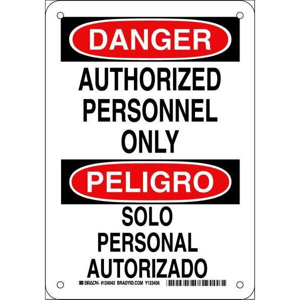 Danger Sign, Sign Subject Matter Authorized Personnel and Restricted Access, Height 10 in, Width 7 in, Sign Material Aluminum, Sign Mounting Style With Mounting Holes, Header Danger/Peligro, Legend Authorized Personnel Only/Solo Personal Autorizado, Printed Language English, Spanish, Sign Shape Rectangle