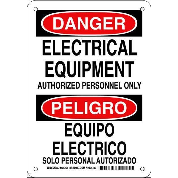 Danger Sign, Sign Subject Matter Electrical Hazard, Height 10 in, Width 7 in, Sign Material Plastic, Sign Mounting Style With Mounting Holes, Header Danger/Peligro, Legend Electrical Equipment Authorized Personnel Only/Equipo Electrico, Printed Language English, Spanish, Sign Shape Rectangle