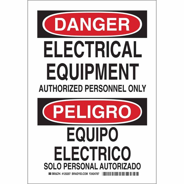 Danger Sign, Sign Subject Matter Electrical Hazard, Height 10 in, Width 7 in, Sign Material Polyester, Sign Mounting Style Adhesive Surface, Header Danger/Peligro, Legend Electrical Equipment Authorized Personnel Only/Equipo Electrico, Printed Language English, Spanish, Sign Shape Rectangle