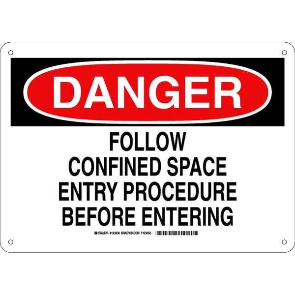 Danger Sign, Sign Subject Matter Confined Space, Height 10 in, Width 14 in, Sign Material Aluminum, Sign Mounting Style With Mounting Holes, Header Danger, Legend Follow Confined Space Entry Procedure Before Entering, Printed Language English, Sign Shape Rectangle