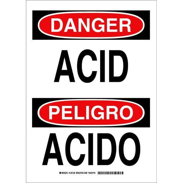 Danger Sign, Sign Subject Matter Chemical, Gas or Hazardous Materials, Height 14 in, Width 10 in, Sign Material Polyester, Sign Mounting Style Adhesive Surface, Header Danger/Peligro, Legend Acid/Acido, Printed Language English, Spanish, Sign Shape Rectangle