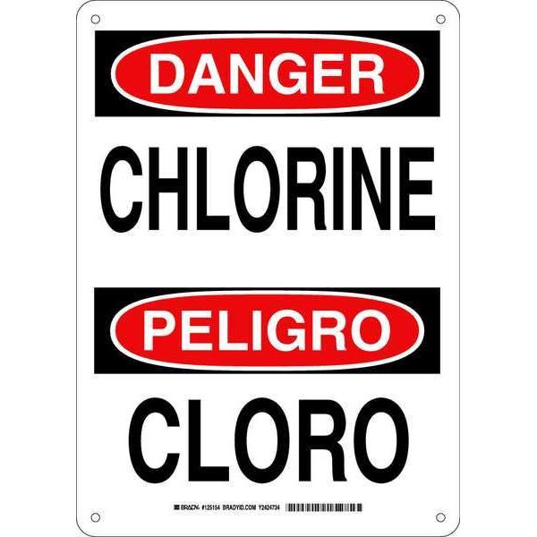 Danger Sign, Sign Subject Matter Chemical, Gas or Hazardous Materials, Height 14 in, Width 10 in, Sign Material Aluminum, Sign Mounting Style With Mounting Holes, Header Danger/Peligro, Legend Chlorine/Cloro, Printed Language English, Spanish, Sign Shape Rectangle