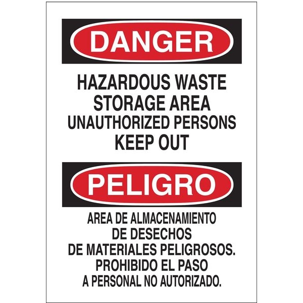 Danger Sign, Sign Subject Matter Authorized Personnel and Restricted Access, Height 14 in, Width 10 in, Sign Material Aluminum, Sign Mounting Style With Mounting Holes, Header Danger/Peligro, Legend Hazardous Waste Storage Area Unauthorized Persons Keep Out/Area De Almacenamiento De Desechos De Materiales Peligrosos. Prohibido El Paso A Personal No Autorizado, Printed Language English, Spanish, Sign Shape Rectangle