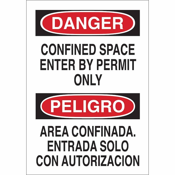 Danger Sign, Sign Subject Matter Confined Space, Height 14 in, Width 10 in, Sign Material Polyester, Sign Mounting Style Adhesive Surface, Header Danger/Peligro, Legend Confined Space Enter By Permit Only/Area Confinada. Entrada Solo Con Autorizacion, Printed Language English, Spanish, Sign Shape Rectangle